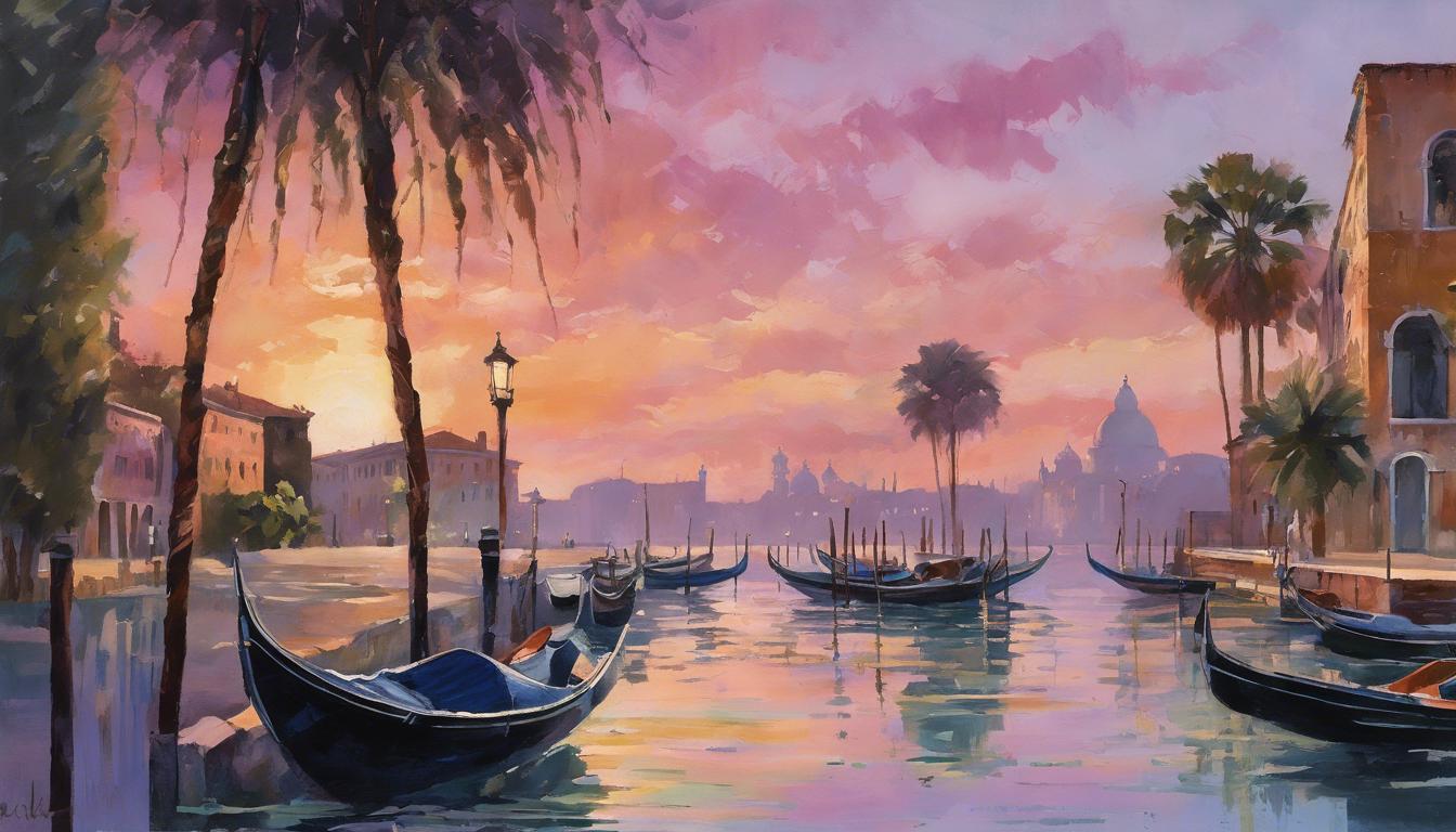 With gondolas gliding on a mirrored expanse,