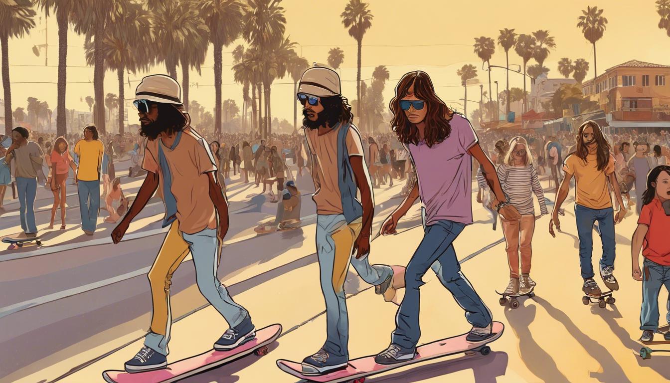 Venice is a cool place in Los Angeles, US. It's near the beach and always buzzing with people. Long ago, in the 1950s, some kids had an idea. They loved surfing in the ocean but wanted to bring that fun to the streets. So, they made skateboards! This was the start of skate culture in Venice.