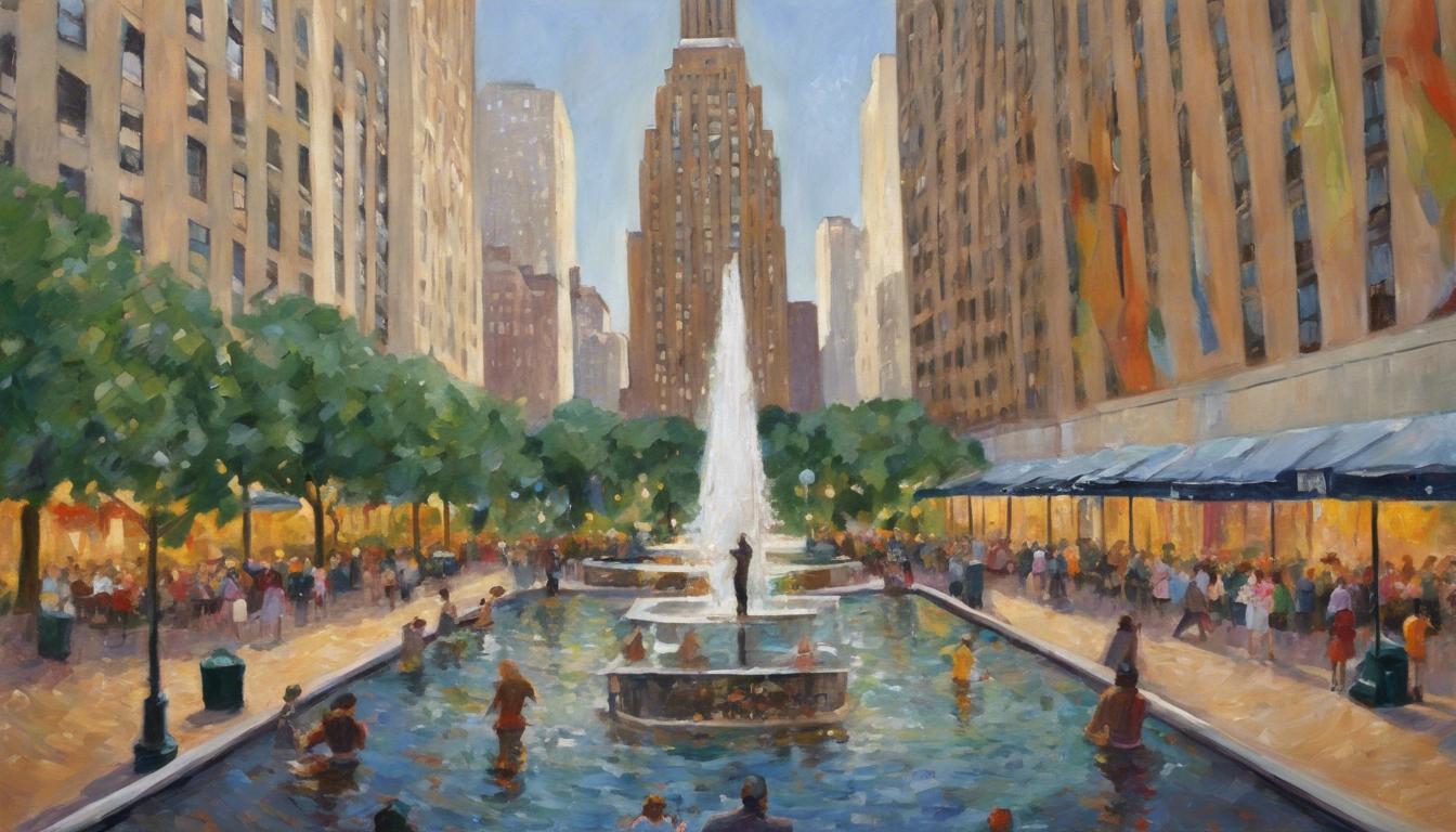 In its early days, the plaza's centerpiece be the majestic GE Building, also known as the RCA Building, towerin' high at 850 feet. The behemoth be finished in 1933 and stands as a testament to Art Deco design. The plaza is well-known fer its iconic ice skating rink, built in 1936, attractin' skaters and spectators alike, surrounded by splendid sculptures and seasonal decorations.