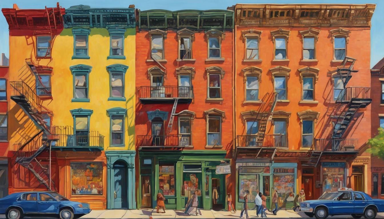 - Note the narrow, five- or six-story buildings with fire escapes zigzagging across the facades.